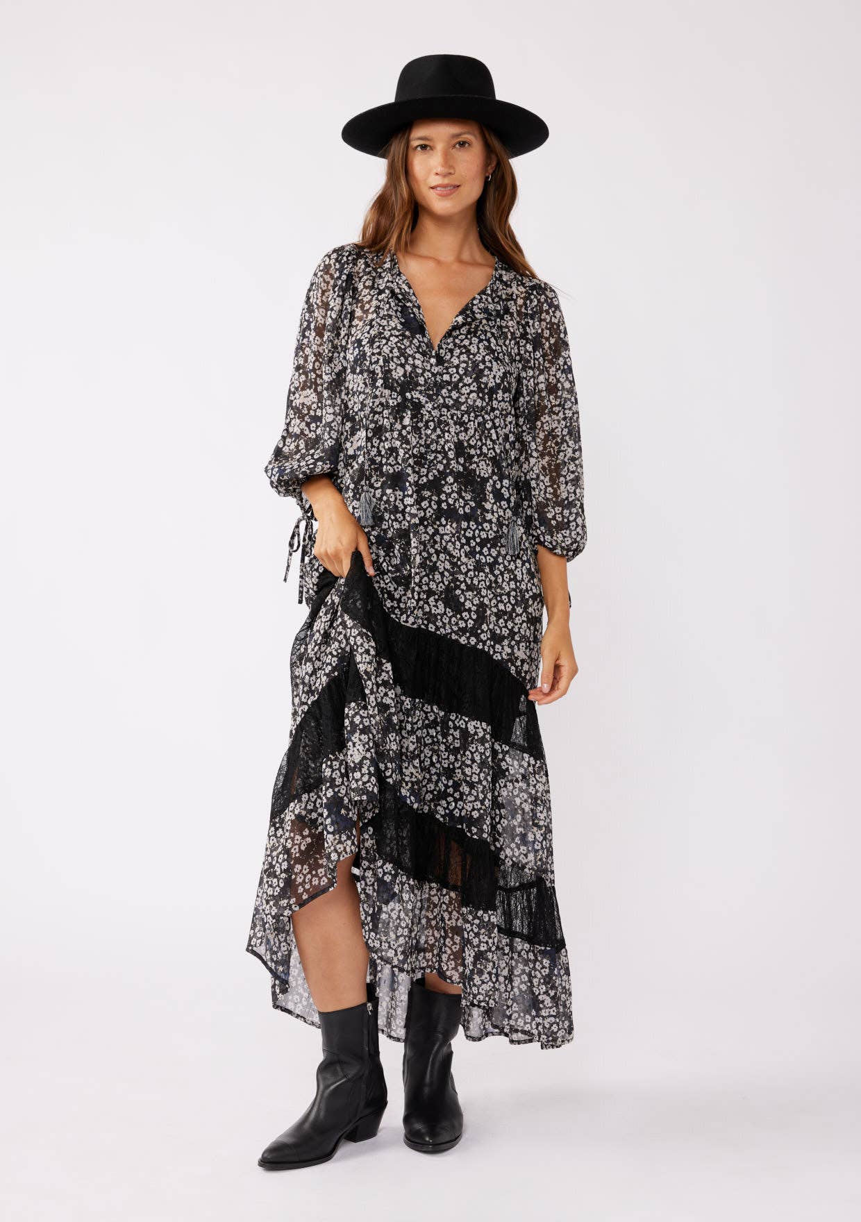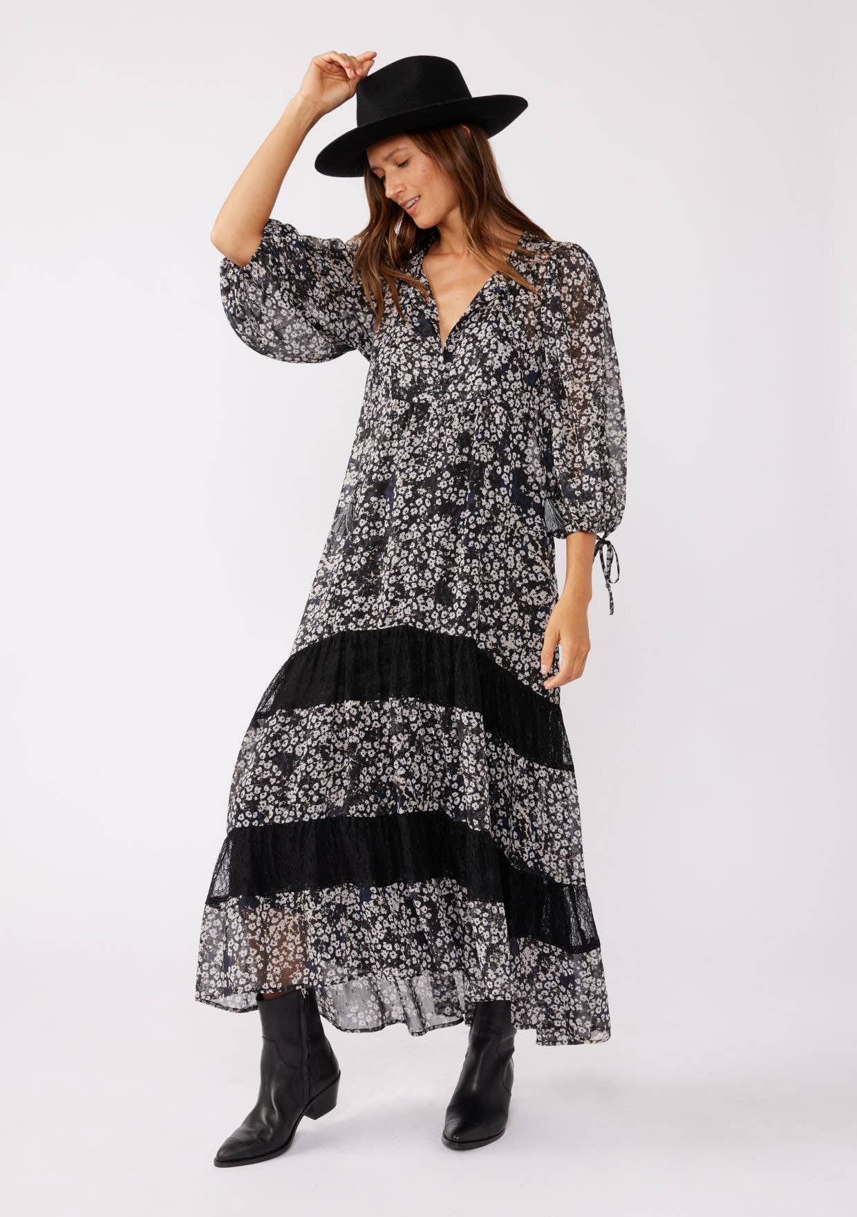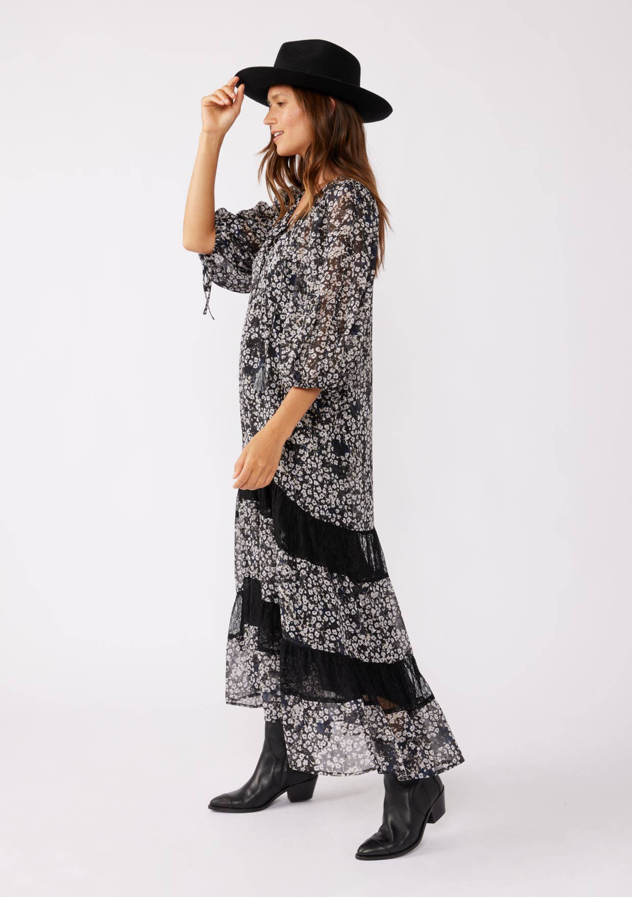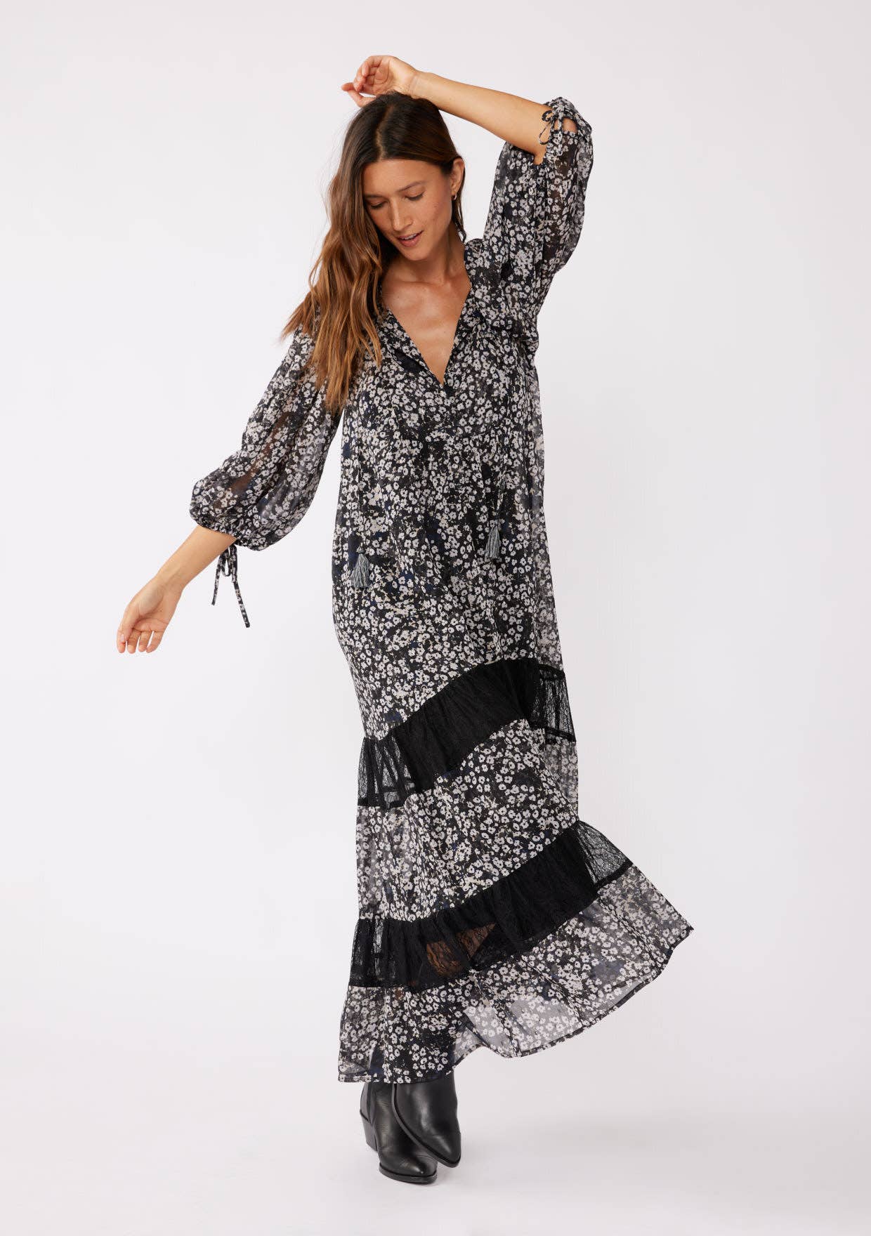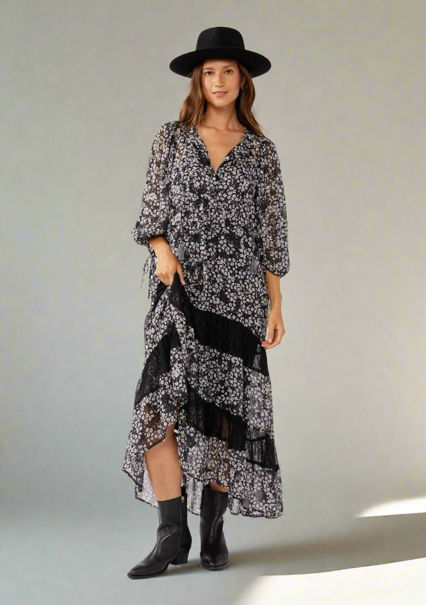 Graceful and airy, our 3/4 Balloon Sleeve Tiered Maxi Dress is crafted from floral lurex chiffon with delicate lace trim. It features a button front adorned with necktie tassels at the ends and spaghetti string cuffs, offering elegance and charm in every detail. The dress also includes a detachable slip dress for added versatility and comfort.