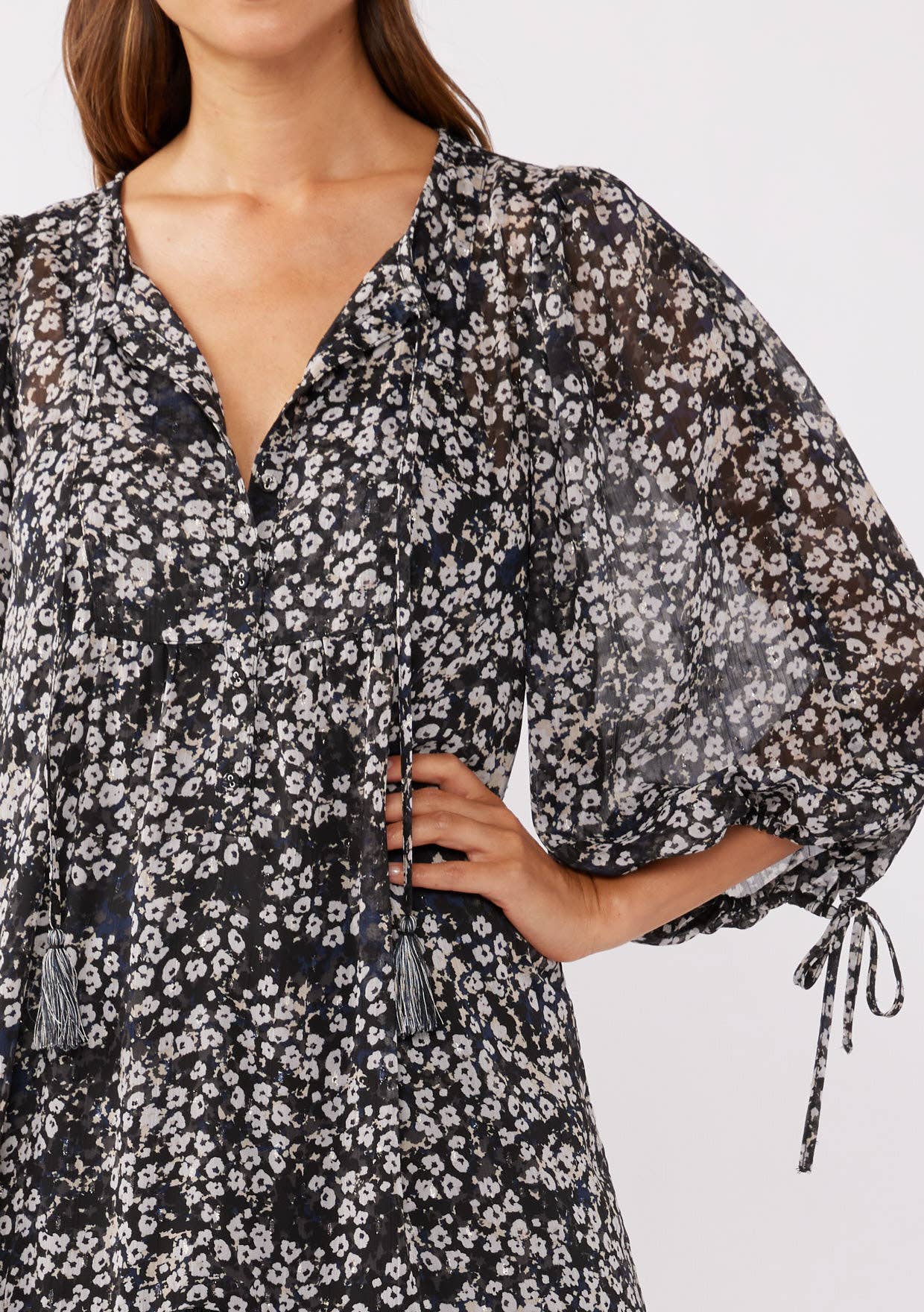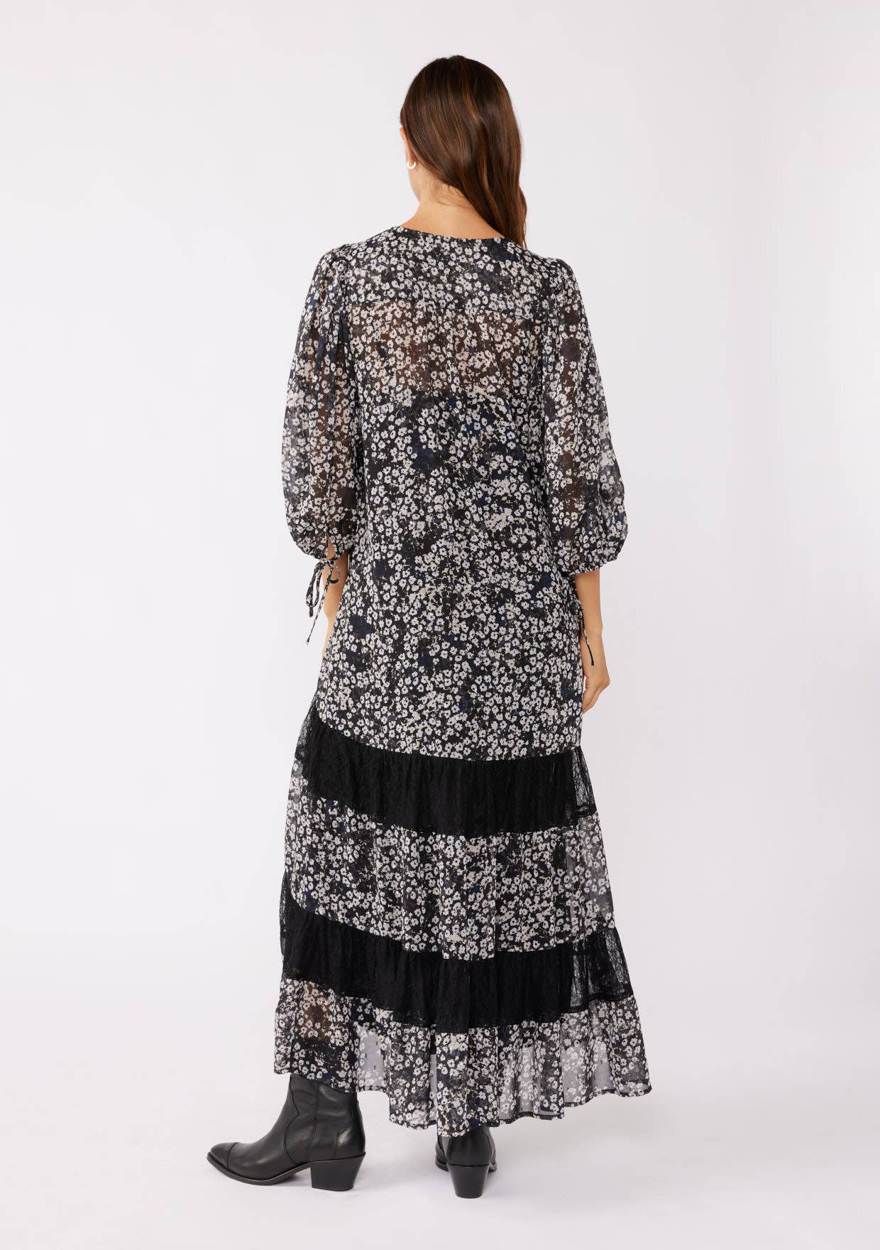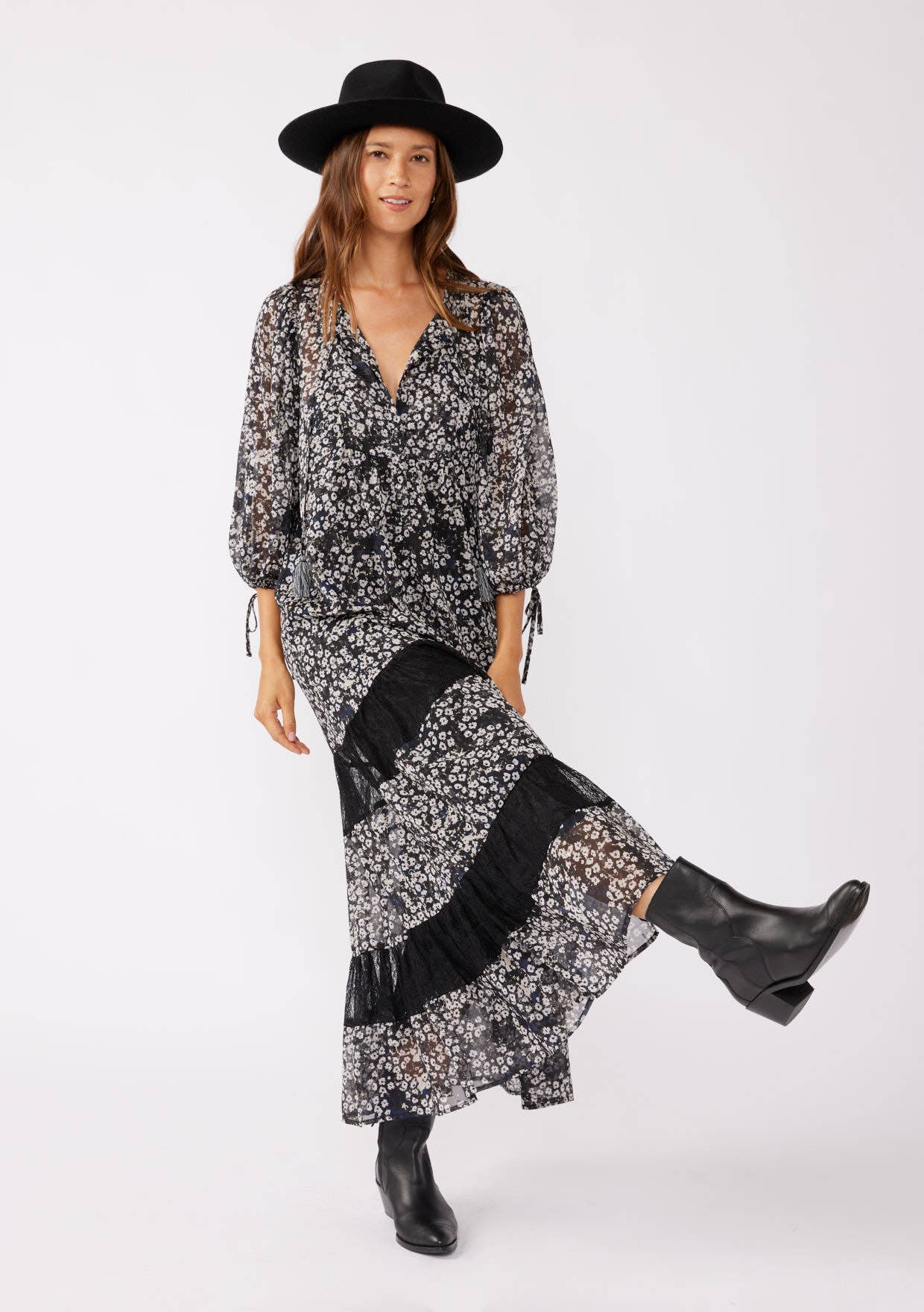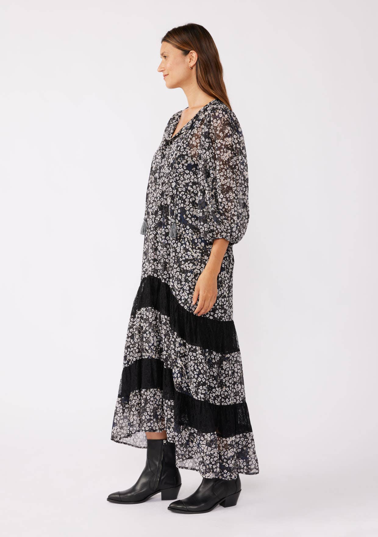 Graceful and airy, our 3/4 Balloon Sleeve Tiered Maxi Dress is crafted from floral lurex chiffon with delicate lace trim. It features a button front adorned with necktie tassels at the ends and spaghetti string cuffs, offering elegance and charm in every detail. The dress also includes a detachable slip dress for added versatility and comfort.