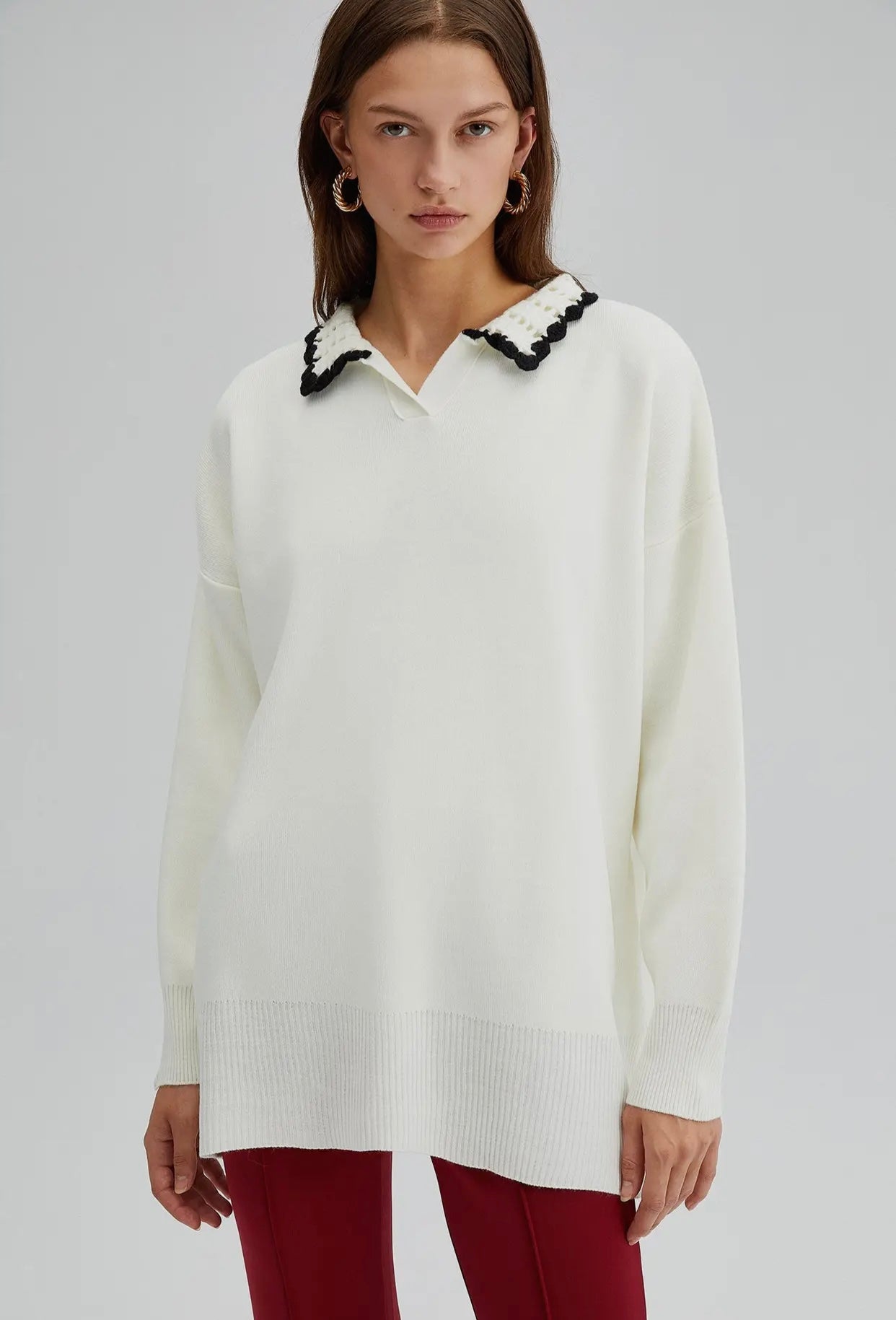 the Ingrid Sweater is a creamy white long sleeve with v-neckline. This otherwise simple design is made unique with the addition of it’s hand crochet collar in a contrasting bold black.