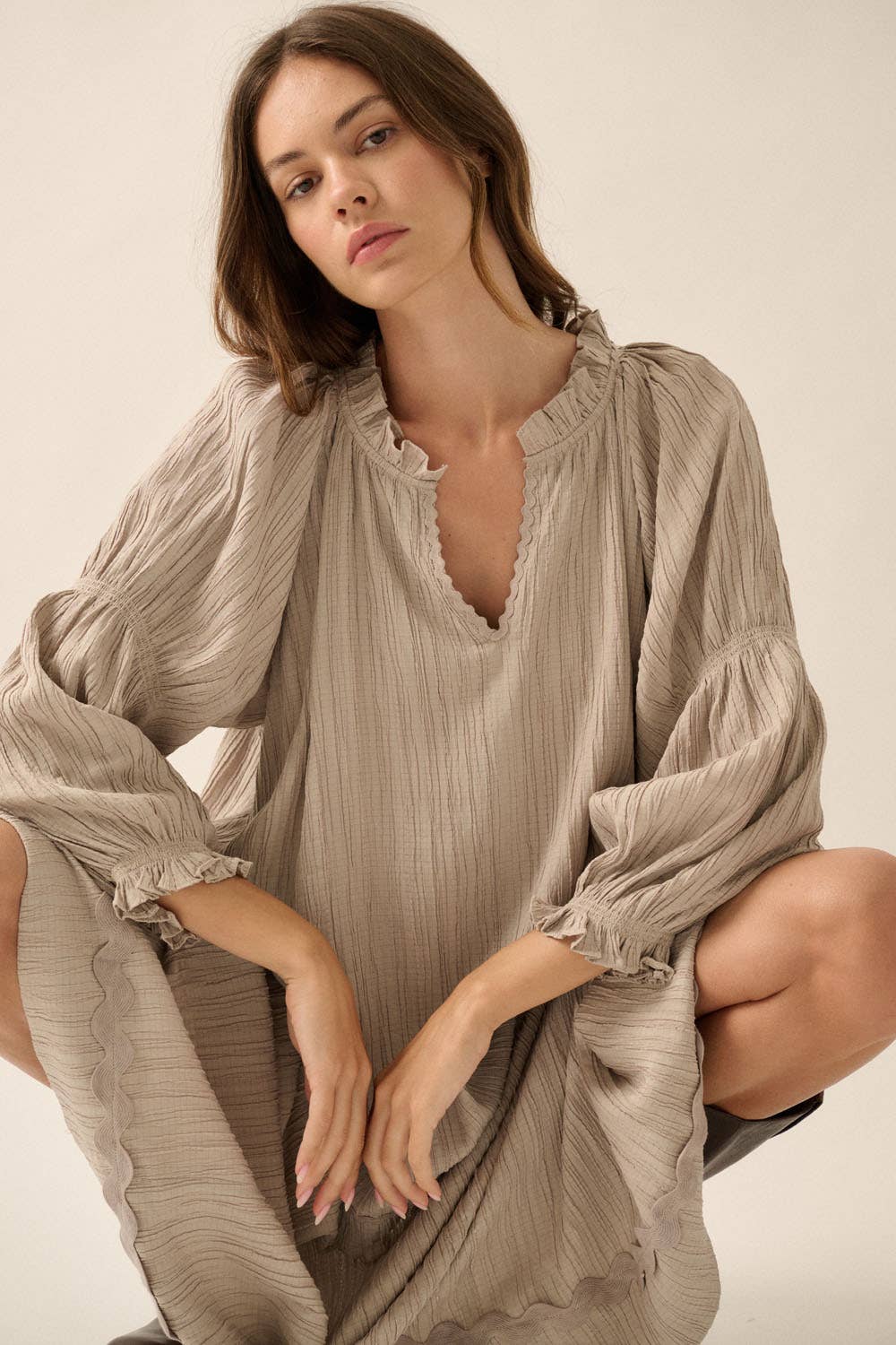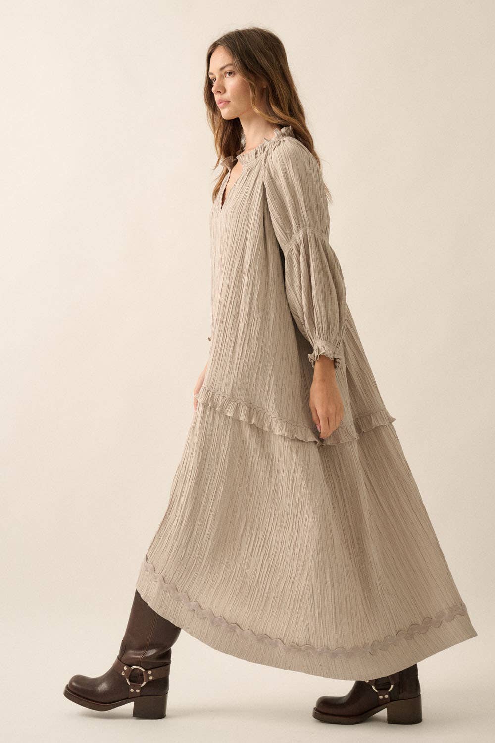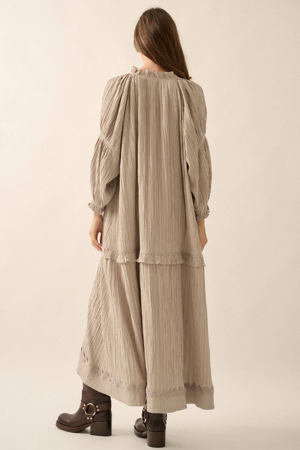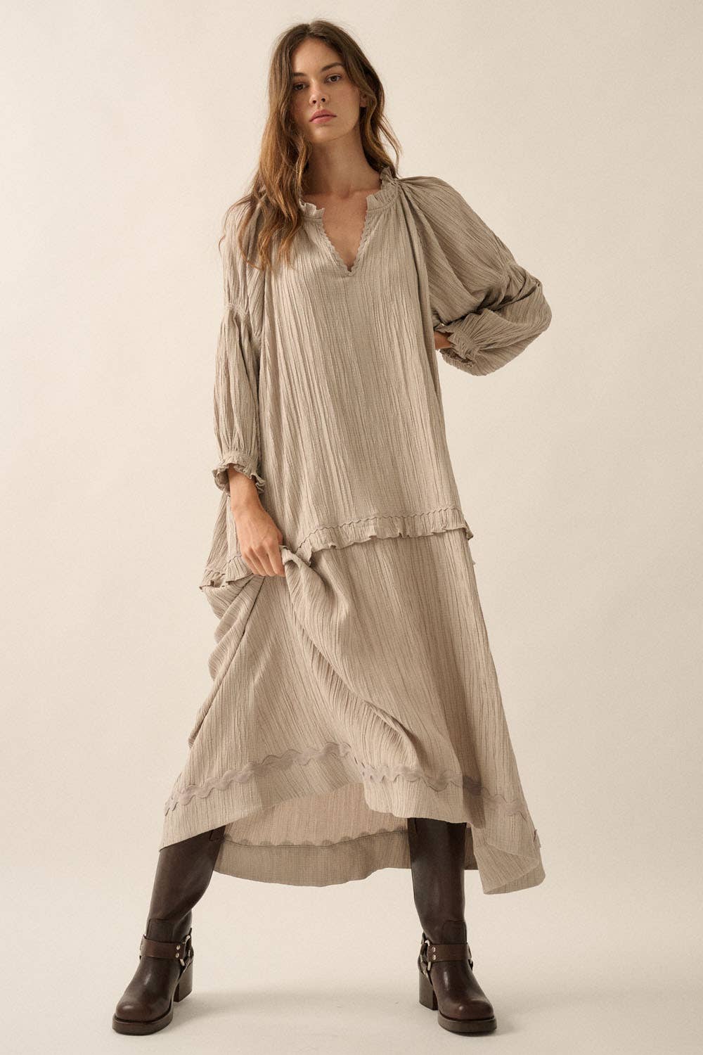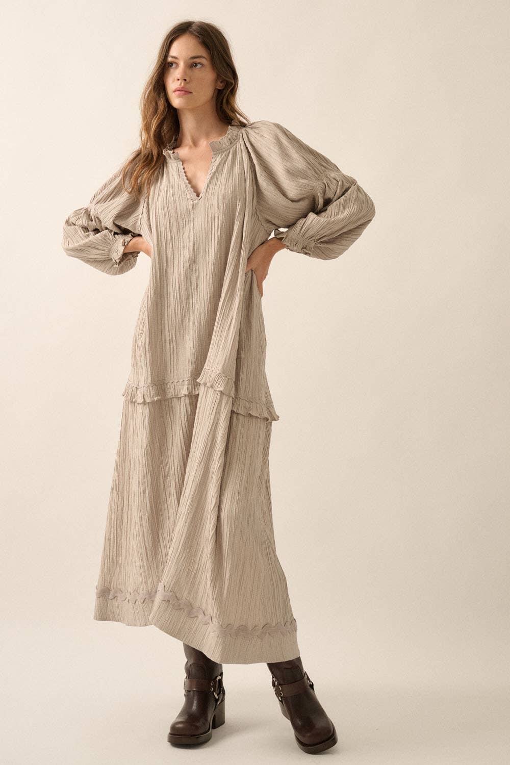 A textured knit maxi dress with V neckline and tiered ruffle skirt. Long-raglan wide-sleeves with smocked armbands and cuffs. Rickrack trim along neckline, shoulders and skirt. Ankle length and loose fit.