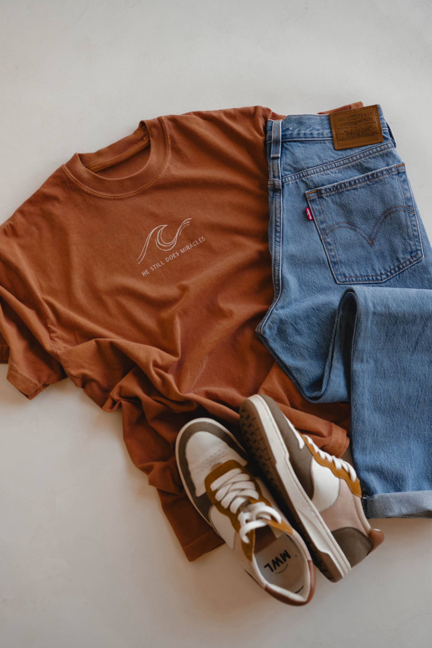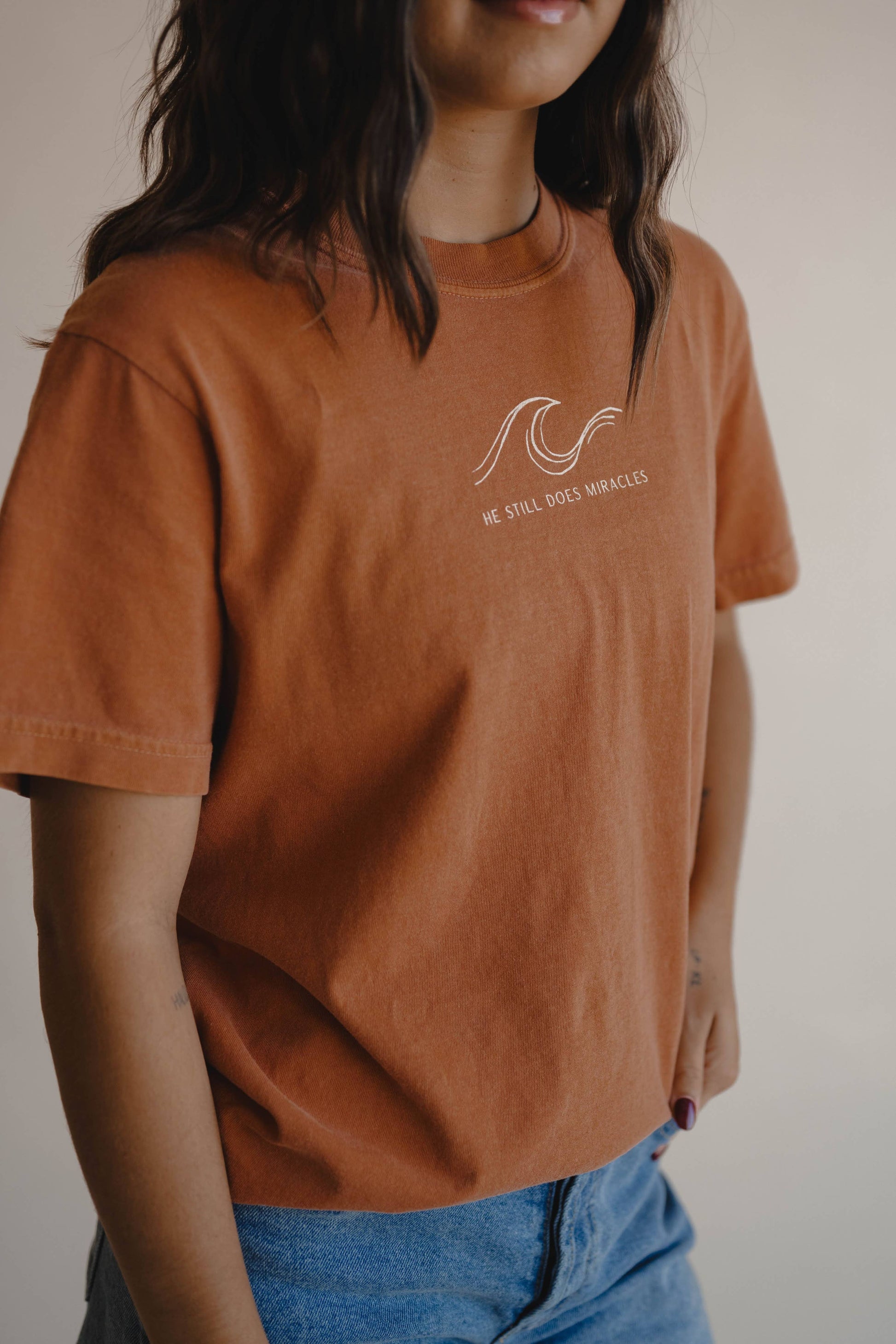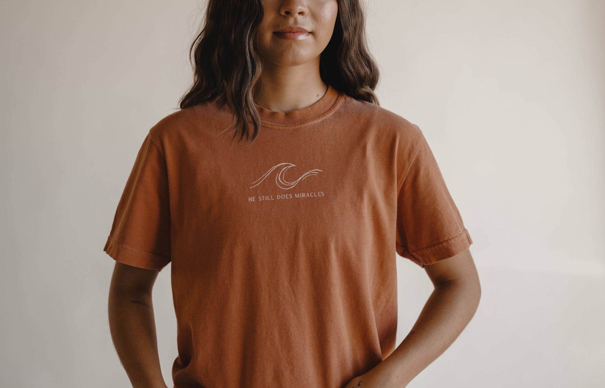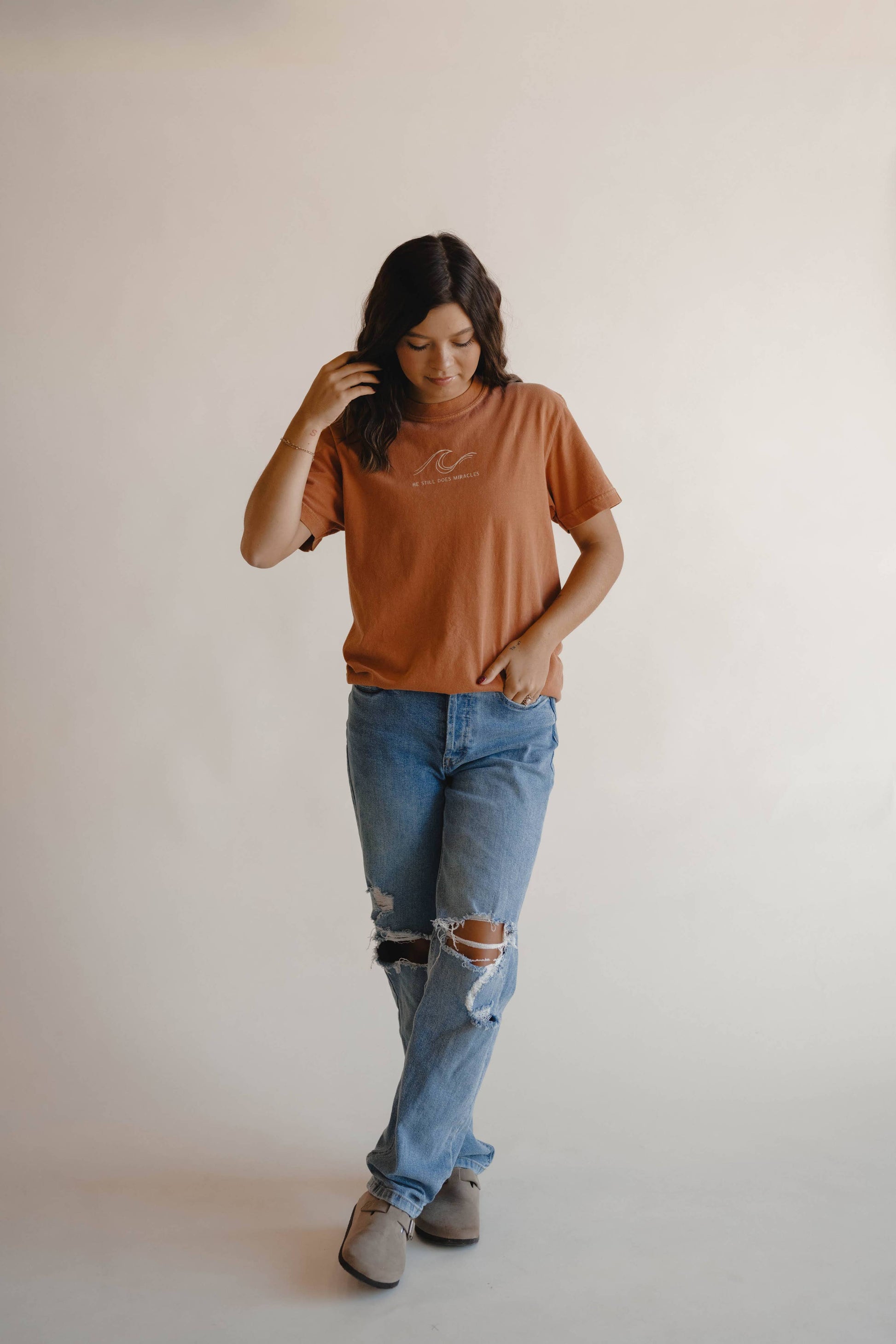 Comfort Colors Tee in color Clay. Garment dyed, soft-washed fabric for that lived in feel and almost no shrinkage. Relaxed fit with seamless body. Made of 100% soft ring spun cotton. Topstitched, classic width, with rib collar. Made with OEKO-TEX certified low-impact dyes and proud member of the U.S. Cotton Trust Protocol. Screen printed in Texas